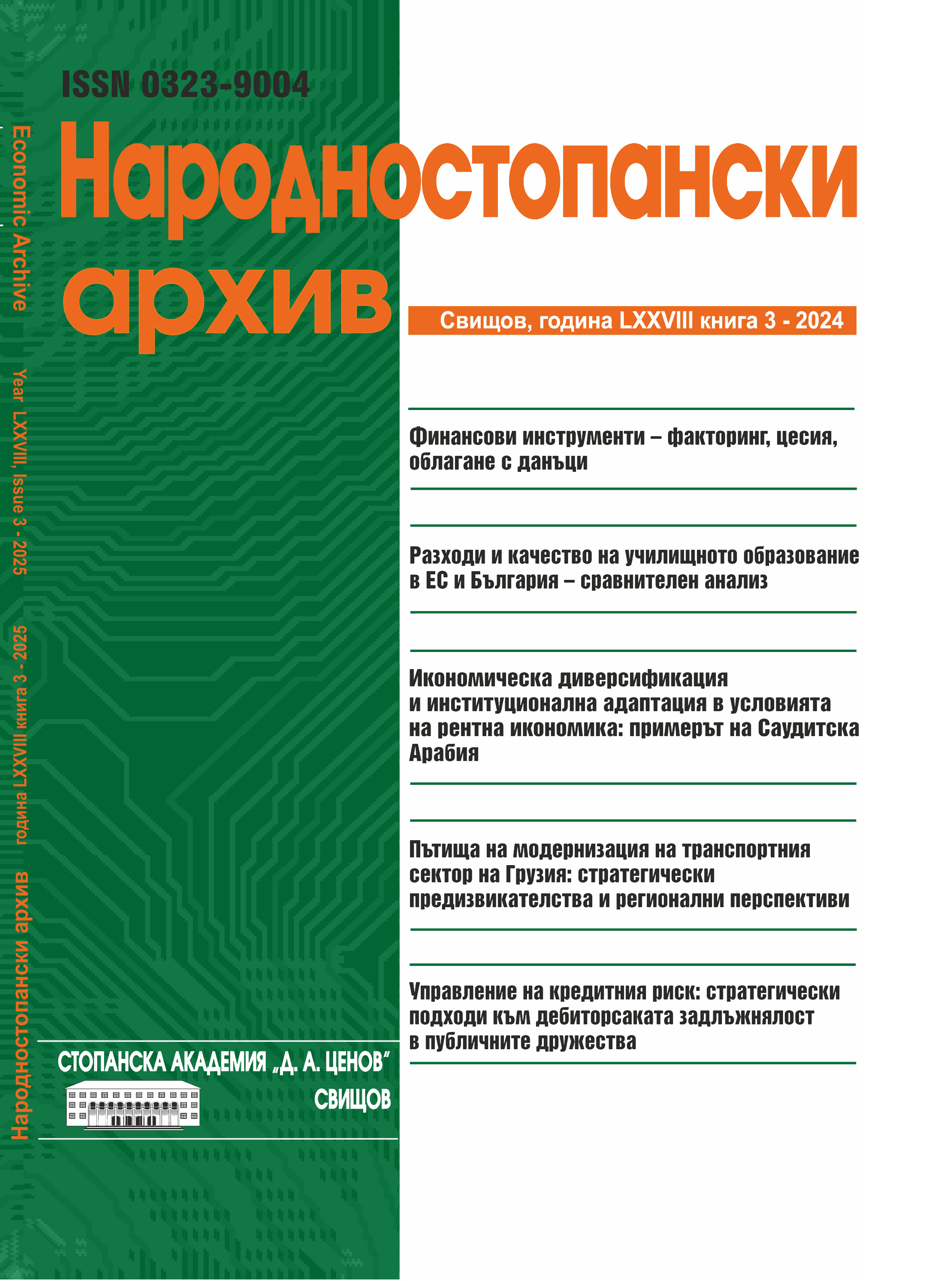 Бойко Петев Финансови инструменти – факторинг, цесия, облагане с данъци / 3 Людмил Найденов Разходи и качество на училищното образование в ЕС и България – сравнителен анализ / 15 Даниел Петров Икономическа диверсификация и институционална адаптация в условията на рентна икономика: примерът на Саудитска Арабия / 32 Теона Концелидзе Пътища на модернизация на транспортния сектор на Грузия: стратегически предизвикателства и регионални перспективи / 45 Борис Стоев Управление на кредитния риск: стратегически подходи към дебиторсаката задлъжнялост в публичните дружества / 68